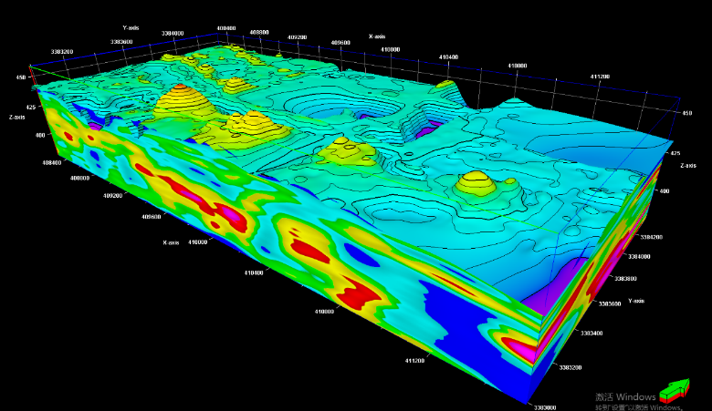 经过精细处理,获得工区三维频域成像数据体,如图2所示。 结合钻孔资料,对层位进行了精细标定。确定浅部各地层单元顶面的解释相位,进而进行全区的追踪闭合,最终得到的层位解释成果。 之后,进行快速三维地质结构建模,获得了工区三维地质结构模型,如图3所示,清晰地展示了工区地下50m以浅的地质结构。